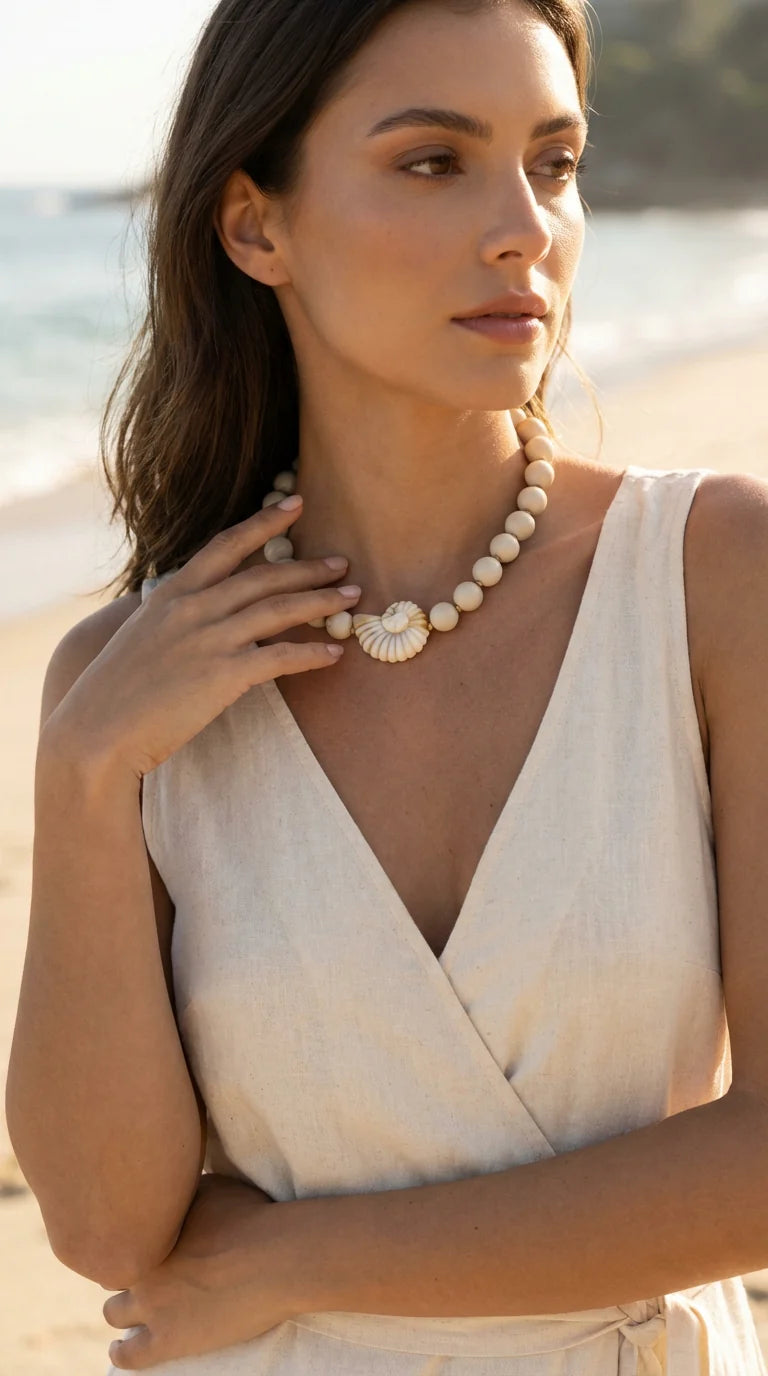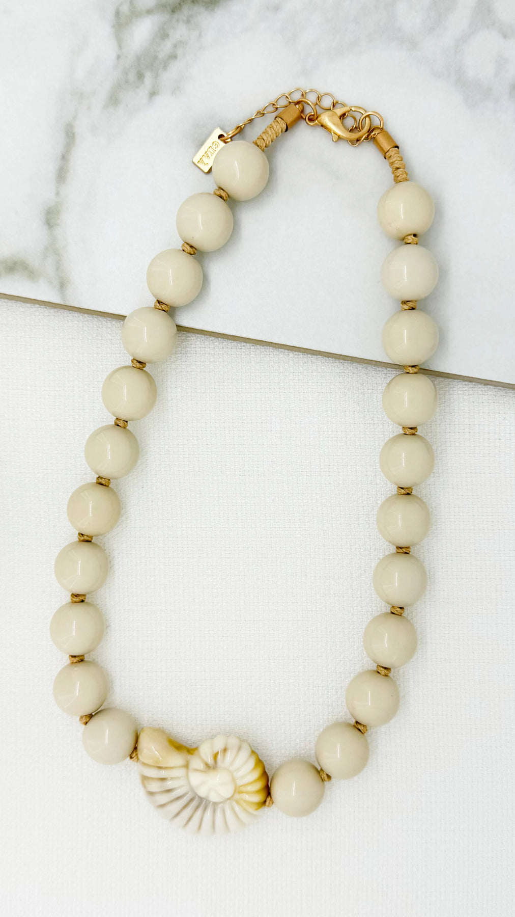 Envy Short Beige Bead Necklace with Fossil Pendant