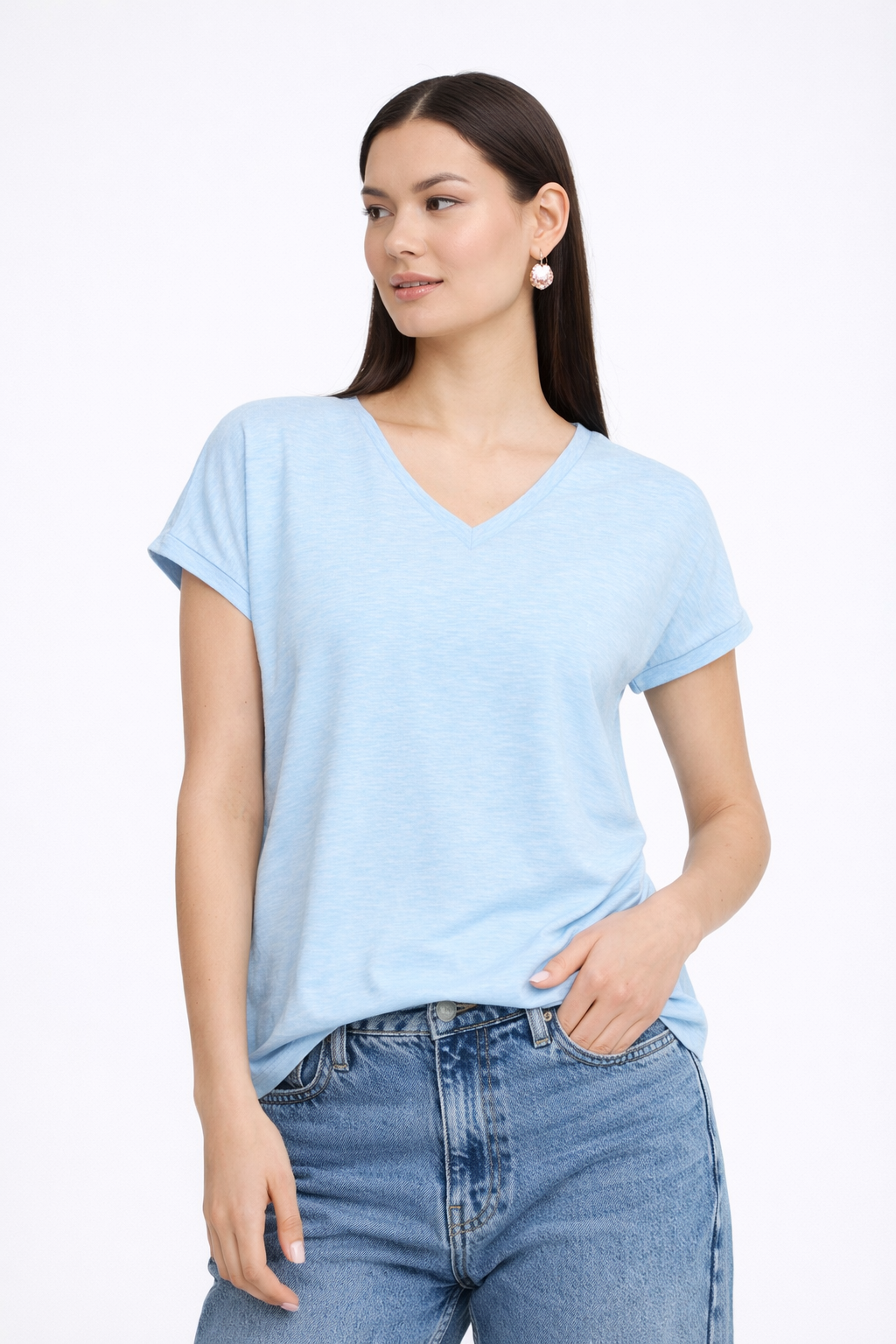 This relaxed-fit T-shirt features a classic round neckline, short sleeves, and a curved hem for easy layering. Soft, comfortable fabric makes it ideal for everyday wear and versatile style, perfect for casual and office outfits.