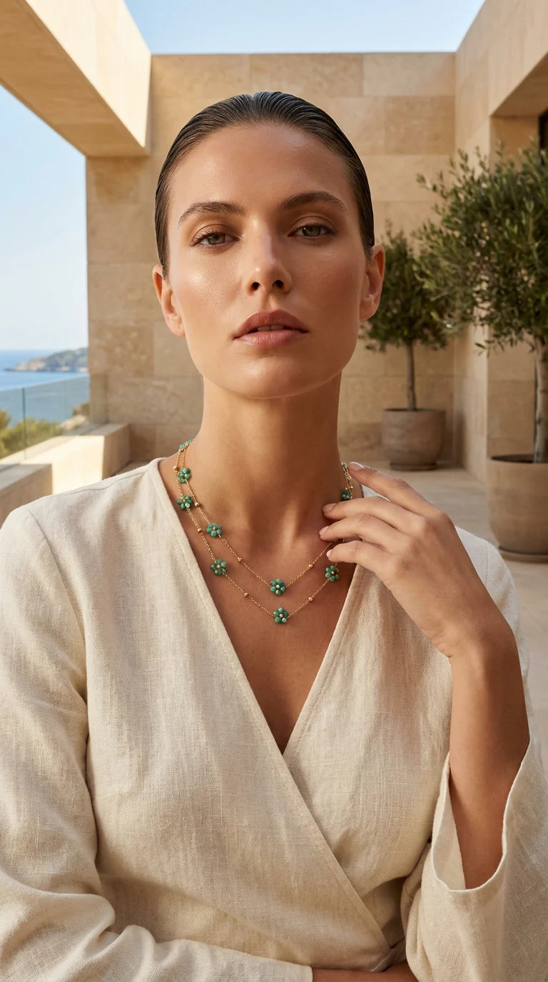 Short Gold Double Layered Necklace with Turquoise Crystal Daisy Design