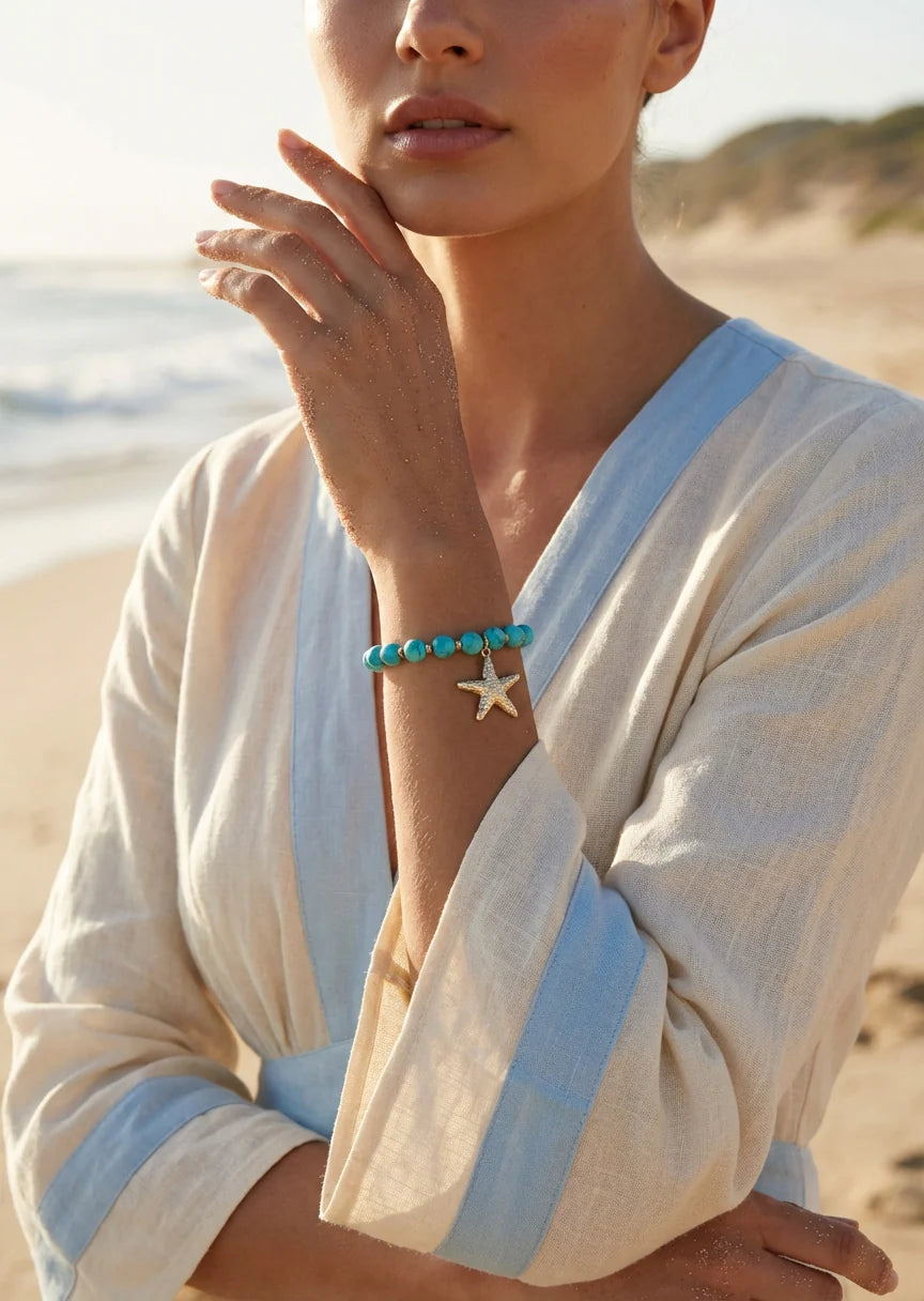 Turquoise Bead Stretch Bracelet with Gold Starfish Charm
