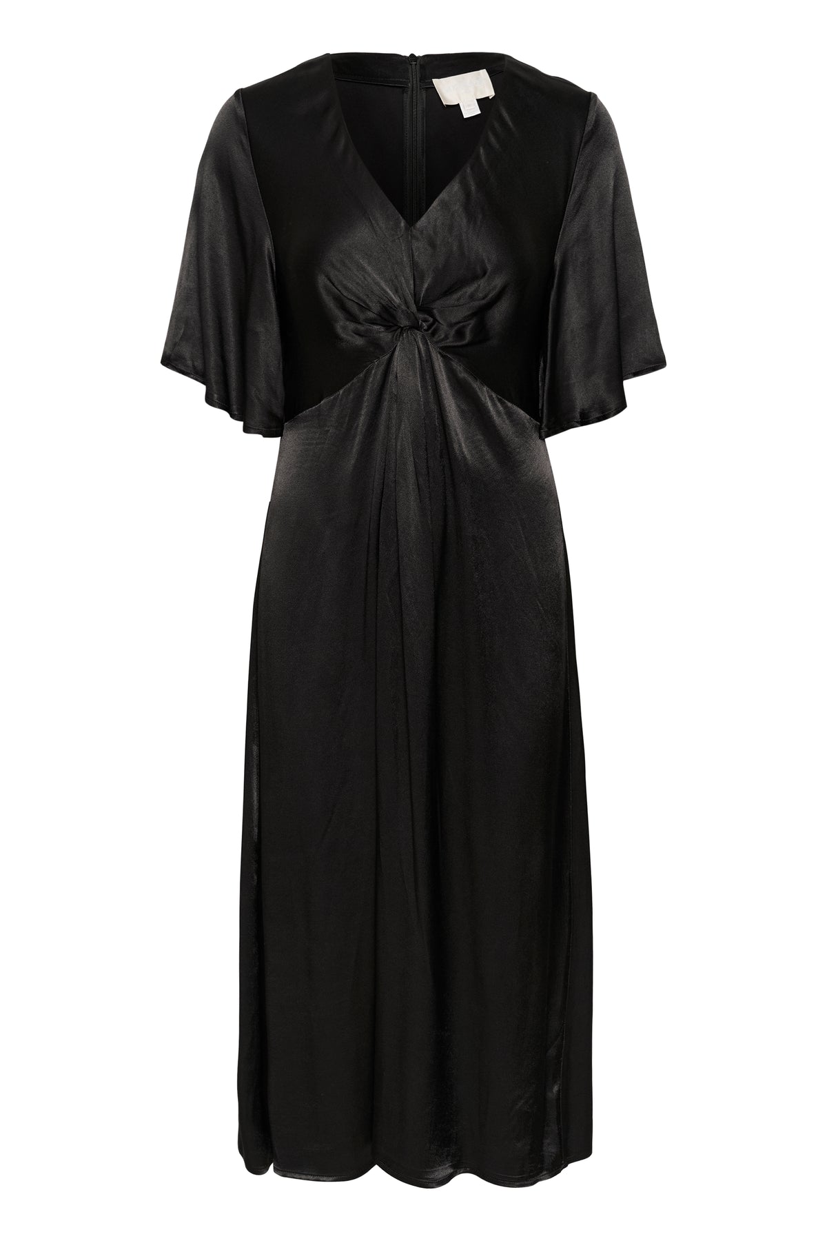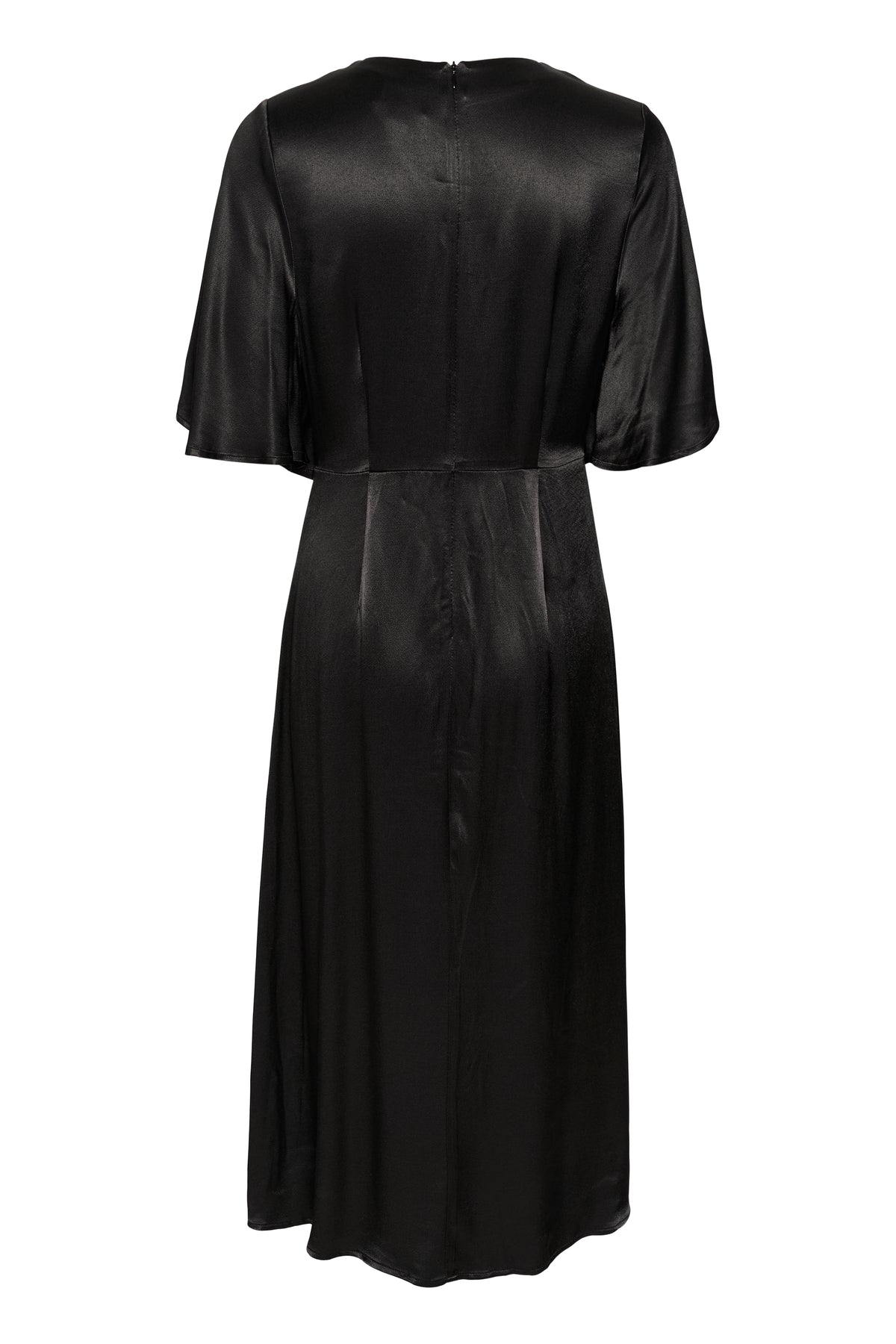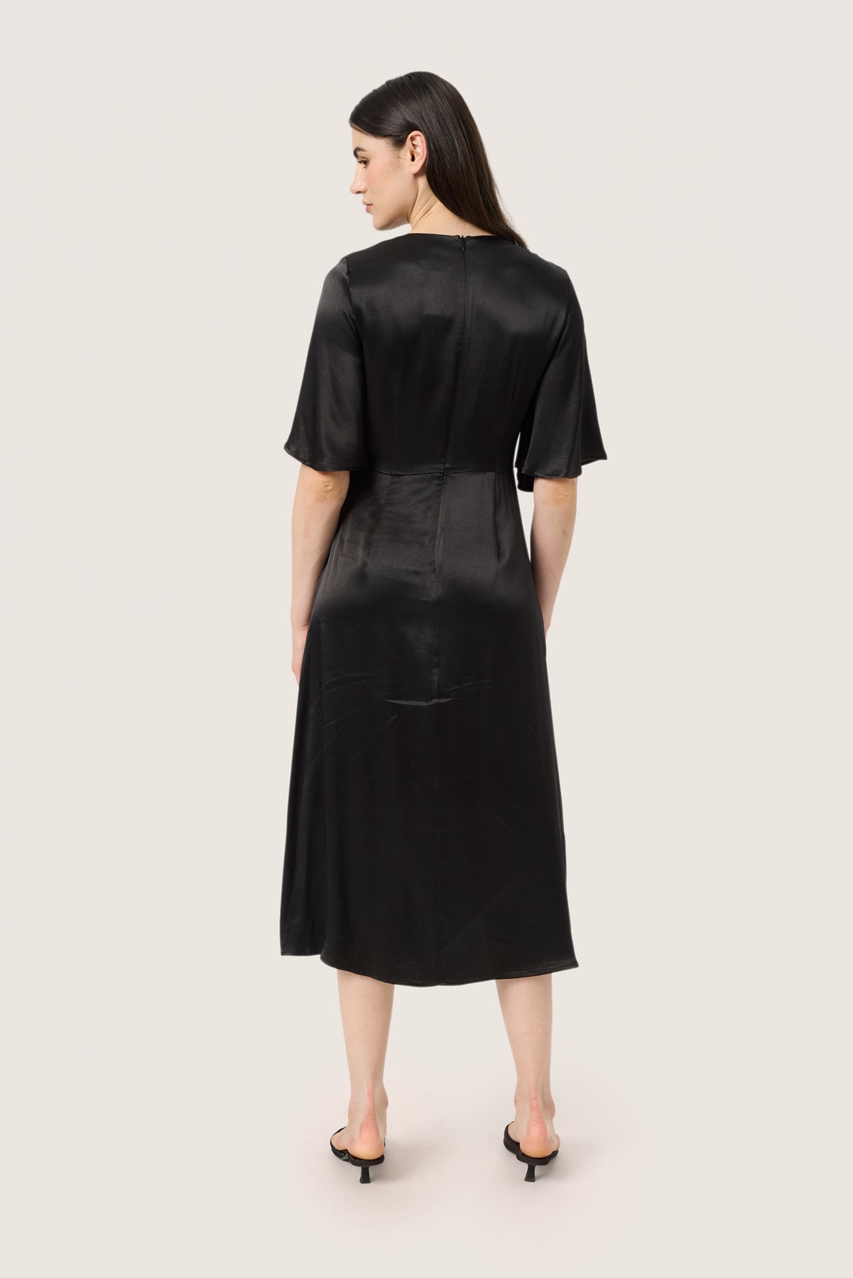 The Milu dress is a beautiful satin dress, perfect for the party season. It has a flattering v-neck and a draped knot detail at the waist which is very elegant. There is an invisible zip at the back. The sleeves are half-length flutter sleeves, and the dress has a flowy skirt that comes down to the calves.