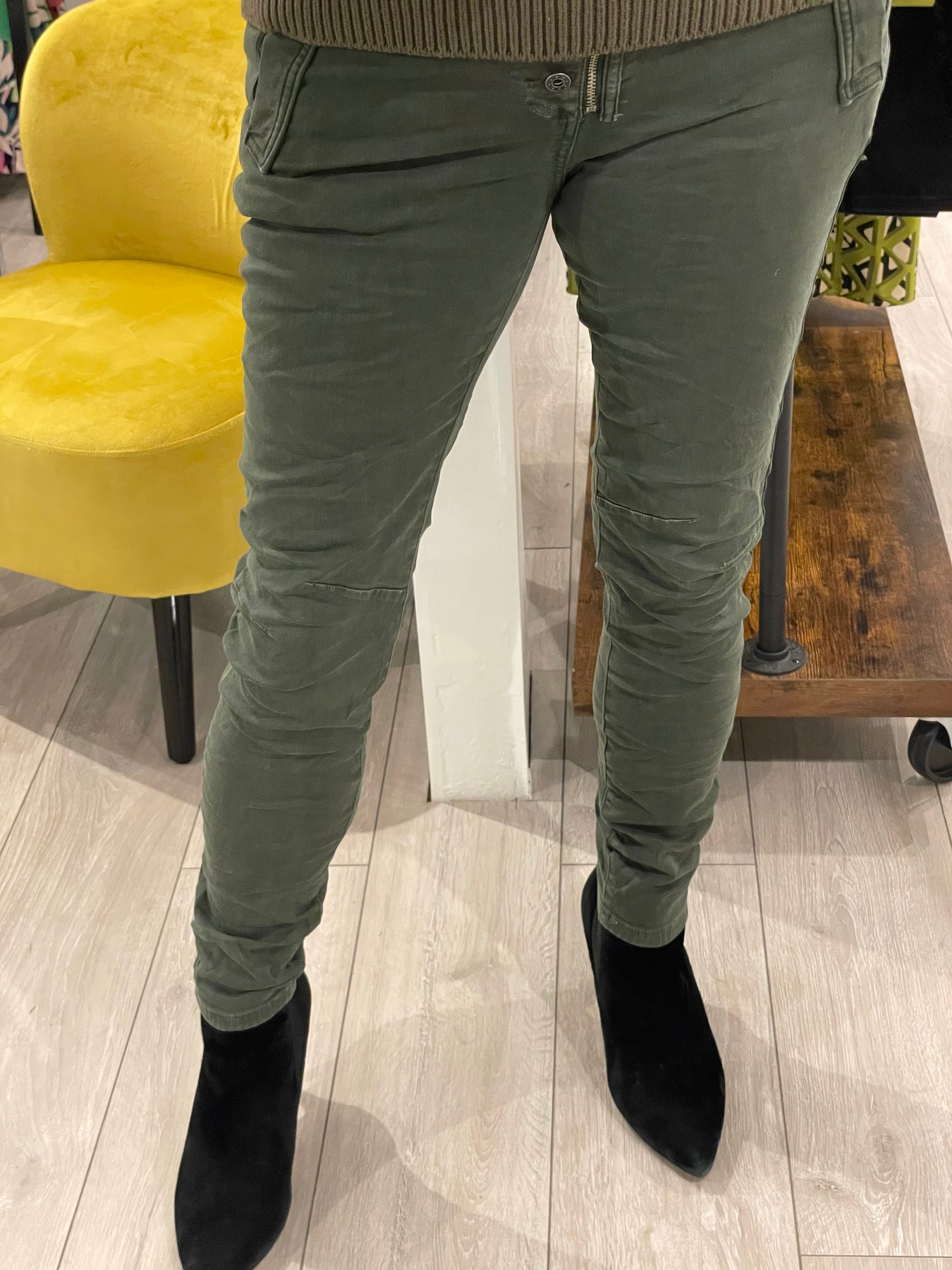 Our bestselling Melly & Co 4 Button Jeans are now in stock in khaki.  These jeans are SO comfortable!  They have just the right amount of stretch and are very flattering.  They have a zip and button fly with pockets at the front and zip pockets on the back.  They retain their shape really well due to their composition.