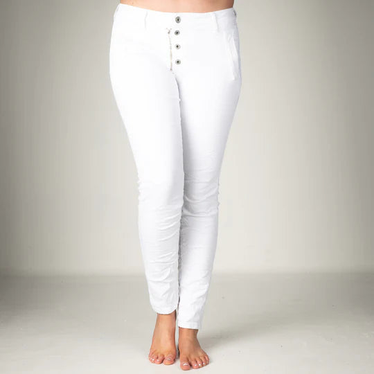 Everyone needs a pair of white jeans in their wardrobe for summer and these are the ultimate pair for style and comfort! They have just the right amount of stretch and are very flattering! They have a zip and button fly with side pockets at the front and zip pockets on the back. They retain their shape really well due to their composition.